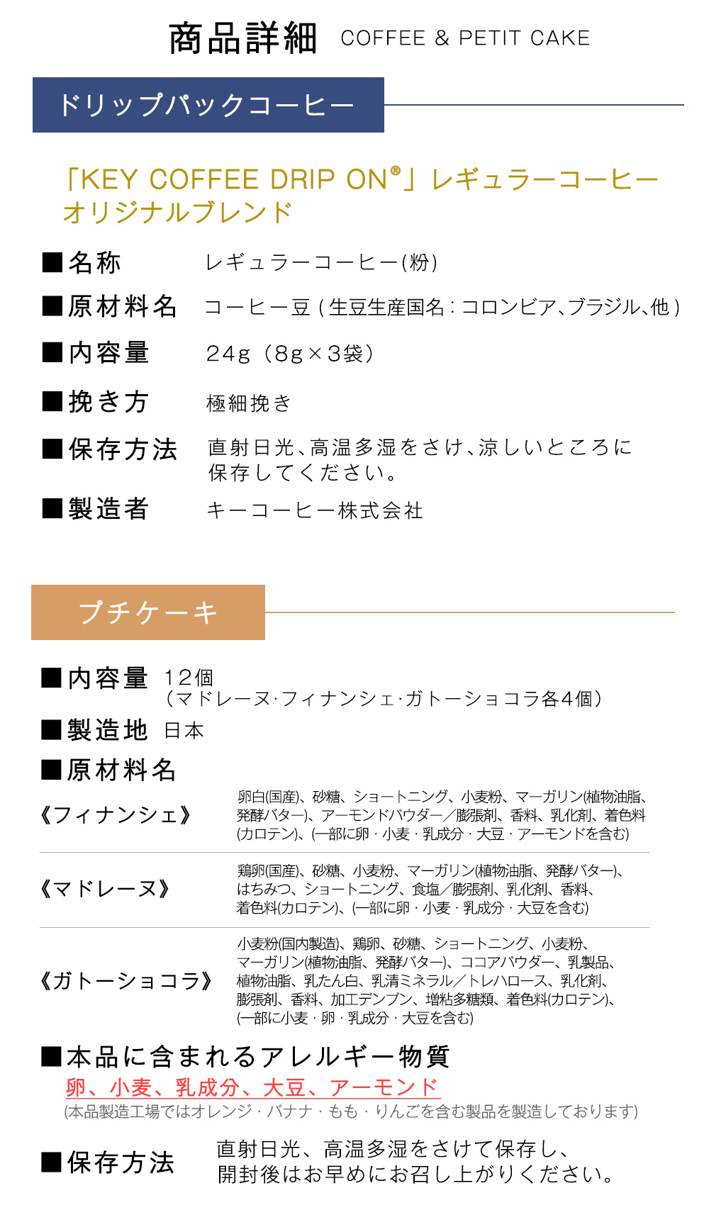 | 商品に含まれるアレルギー物質 | 「プチケーキ」 卵・小麦・乳成分・大豆・アーモンド ※本品製造工場ではオレンジ・バナナ・もも・りんごを含む製品を製造しております。 ※アレルギーの表示内容に関しては事業者の指定に基づき掲載しております。内容を保証するものではございません。 |