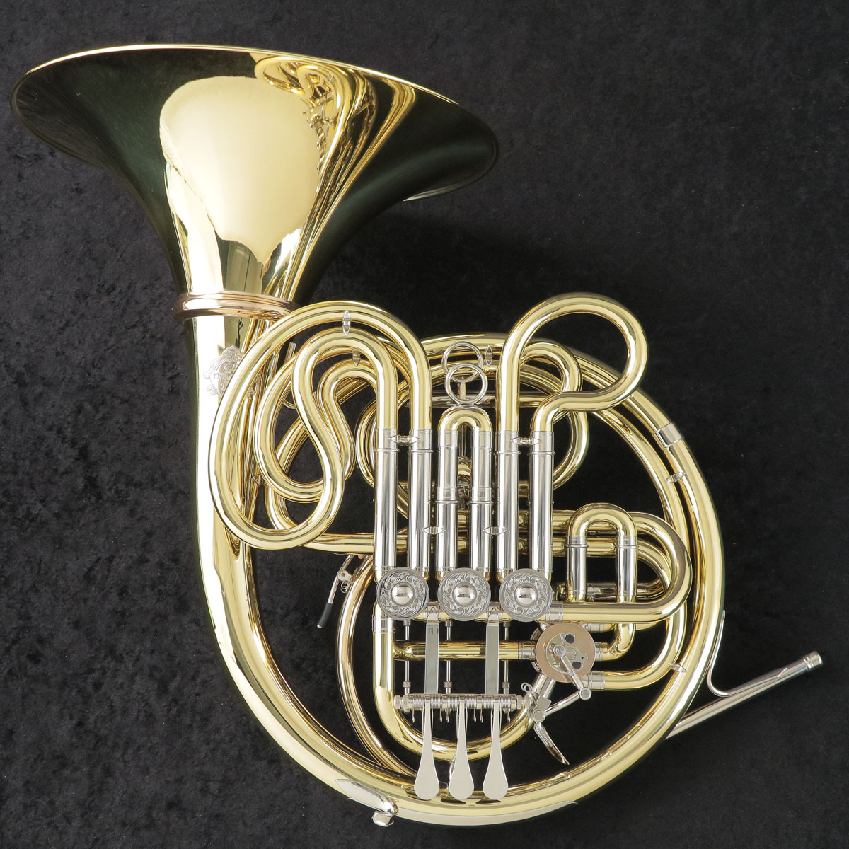 アレキサンダーのホルン103MBLです。フレンチホルン王道のアレキサンダーホルンは世界中のプレイヤーに愛されているブランドです。103MBLはオーケストラでも使用している方が多いと思います。持ち運びにも便利なベルカットで移動が多いプレイヤーにもおすすめです。こちらはわずかに凹みや小キズなど点在しておりますが、使用感は少なく、さほど使用されていなかった印象を受けます。永く愛用できるポテンシャルがあるので育てる楽しさも味わえると思います。