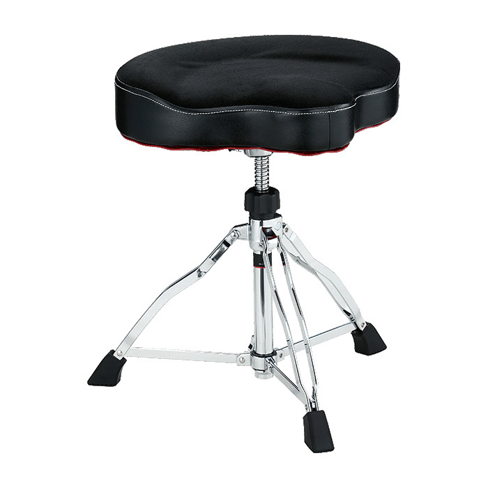 ドラムスローンにとって重要な『座り心地』を決める要素の一つは座面の硬さ。ドラマーはスローンに座った瞬間に感じるその感覚で、そのスローンが自分にフィットしているかどうか判断することができます。座面の硬さはシート形状や素材、表面の生地の伸縮性、縫製の方法などの多くの要素の組み合わせに左右されます。それらを細かく検討し、『体の重心を安定して支え、長時間座った時の疲労の蓄積を軽減する』ことを目標に生まれた1st Chair Glide Rider(グライド・ライダー)ドラムスローンは、シート内部に型成形による硬質の発泡ウレタン、座面の天面はプレイ中の滑りを防ぐ効果があるクロス素材を採用し、今までのTAMA のモデルにはなかった理想的な柔らかさと硬さのバランスを実現したサドル形状のドラムスローンです。