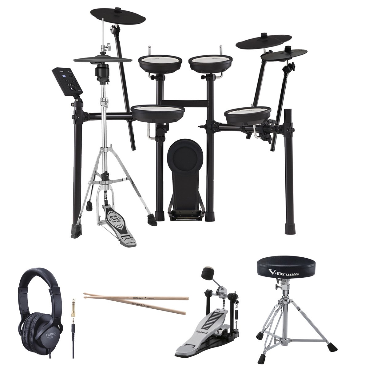●演奏するために必要なオプションが揃ったスターターパックです。セットアップが終わったらすぐに演奏を楽しむことができます。なおローランド純正品を主に採用していますが、ハイハットスタンドはローランドから発売していないため、タマの定番モデルを採用しました。