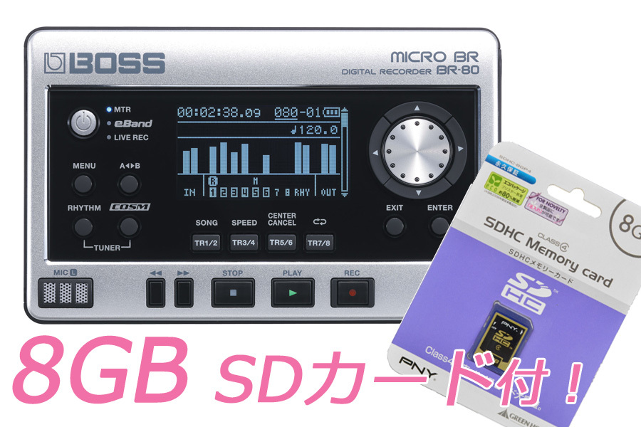 BR-80は、手のひらサイズのコンパクト・ボディながら、本格的な音楽制作を行うことが可能なMICRO BRの最新モデルです。高級感のあるスタイリッシュなアルミ・ボディを採用し、本体にギタ−接続するだけで練習から録音、そして曲づくりまでがこれ一台で行えます。本体には3つのモードを搭載。MTRモードは64Vトラック、最大8トラック同時再生を実現。直感的な操作感で曲づくりが行えます。eBandモードではお気に入りの曲に合わせたフレーズ・トレーニングやセッションが楽しめます。さらに、フレーズ・アイディアやバンド練習などがステレオ録音できるLive Recモードを装備しています。これら機能はシームレスに連携。Live Recモードで録ったフレーズ・アイディアをMTRモードで読み込んで楽曲制作、完成した曲をeBandモードで練習するなど、デジタル・レコーダーの枠を超えた高性能/多機能を実現したギタリスト必携のレコーダーです。