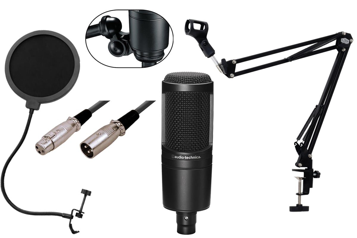 コスパ抜群のコンデンサーマイクAT2020と、3mのマイクケーブル、ポップノイズ対策のポップブロッカー、便利なアーム型マイクスタンド。