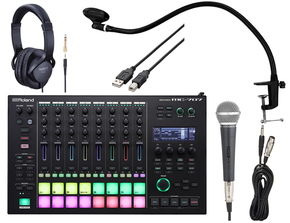 Roland製ヘッドフォン、PCとの接続で使用するUSBケーブル、サンプリングで使えるマイク、デスクに固定して自由自在に動かせるマイクスタンドがセット!
