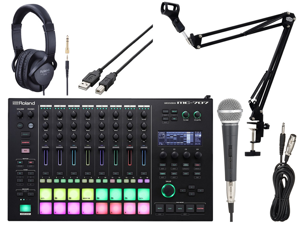 Roland製ヘッドフォン、PCとの接続で使用するUSBケーブル、サンプリングで使えるマイク、上部左右自在に動かせるアーム型マイクスタンドがセット!