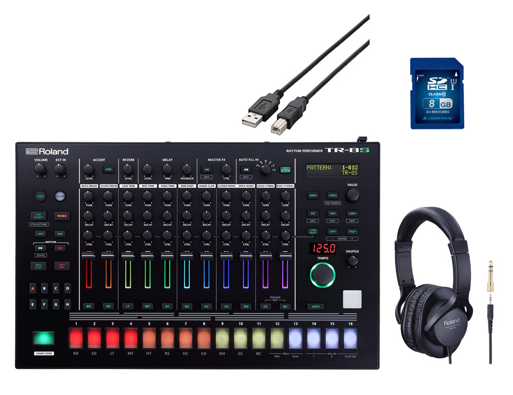 Roland製ヘッドフォン、PCとの接続で使用するUSBケーブル、サンプルロードで使用できる8GBのSDカードがセット!