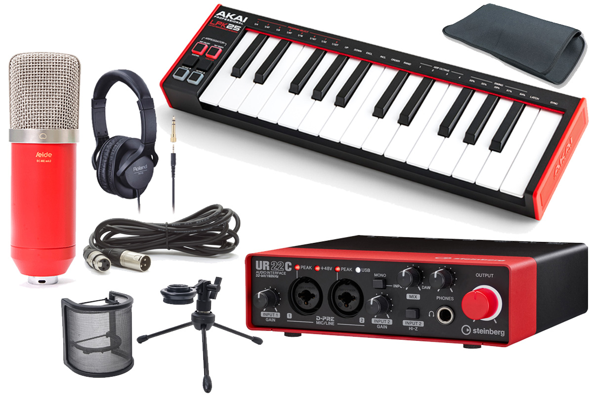オーディオインターフェース UR22Cのカラーバリエーション『UR22C RD』と コンデンサーマイク『EC-Me MK2 Vermilion Red』、ラップトップ・パフォーマンスキーボード『LPK25』がセットでお買い得!