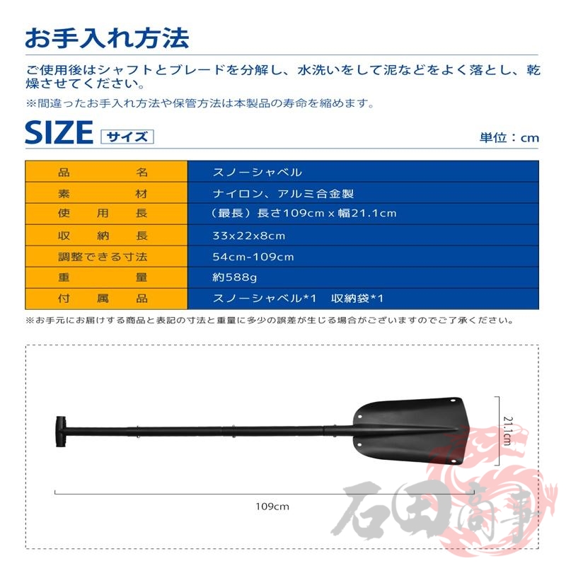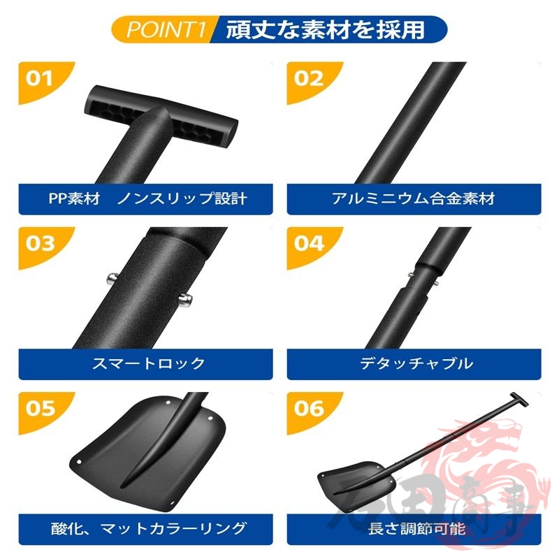 組み立て式雪かきスコップは、軽量で丈夫なアルミ合金を採用で、補強材が施されているため、強度が安定しています。固く凍った雪も効率よく切り出す強度があり、便利でコスパがよく耐久性にもすぐれた携帯用スコップです。また、アルミ製のため軽いのが特徴で、本体の重さはわずか588g!女性の方にも扱いやすいのも魅力です。手軽に持ち運びでき、広範囲の雪かきもスムーズに行えます。