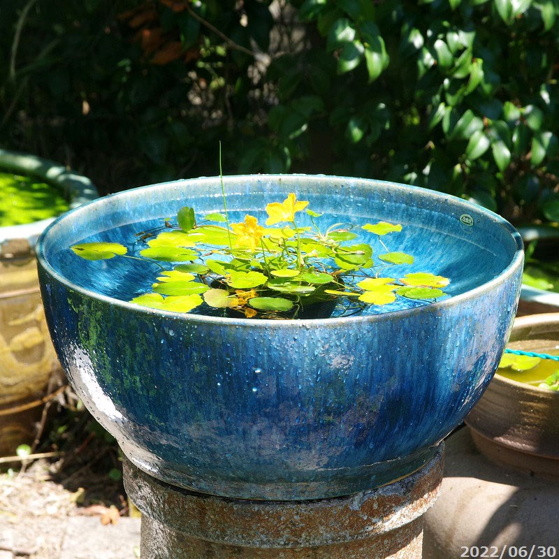 品名: 信楽焼 睡蓮鉢 選べる 手づくり ブルーガラス水鉢 15号(外径45cm 高さ20cm)+お好きな水草 +メダカ5匹(死着保証無)プレゼント
