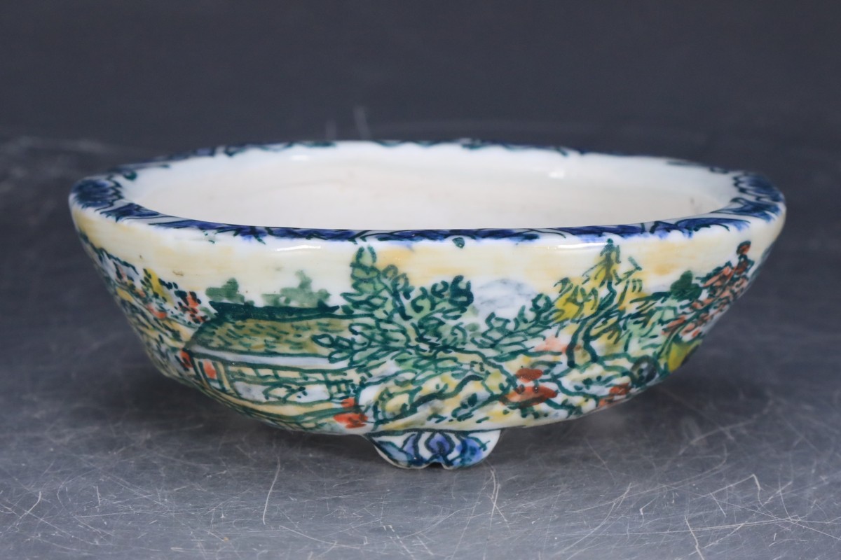 人気和鉢作家 陶翠作「陶翠色絵山水図外縁雲足楕円鉢」