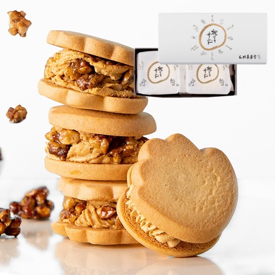 手一本を連想する かわいい手形のクッキーでほろ苦いキャラメルクリームとキャラメリゼしたクルミをサンドした、キャラメルサンドです。