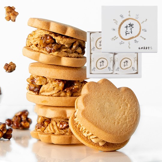 手一本を連想する かわいい手形のクッキーでほろ苦いキャラメルクリームとキャラメリゼしたクルミをサンドした、キャラメルサンドです。