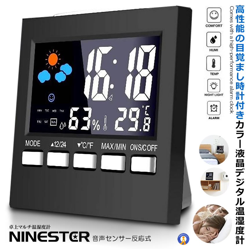 デジタル温湿度計 簡単操作 高性能 カラー液晶 目覚まし時計 卓上電子温湿度計 ホーム バックライト 気象計 アラーム機能 音声センサー DEZICARE 爆買