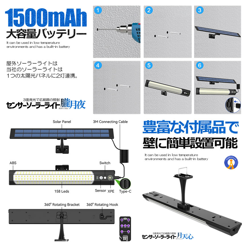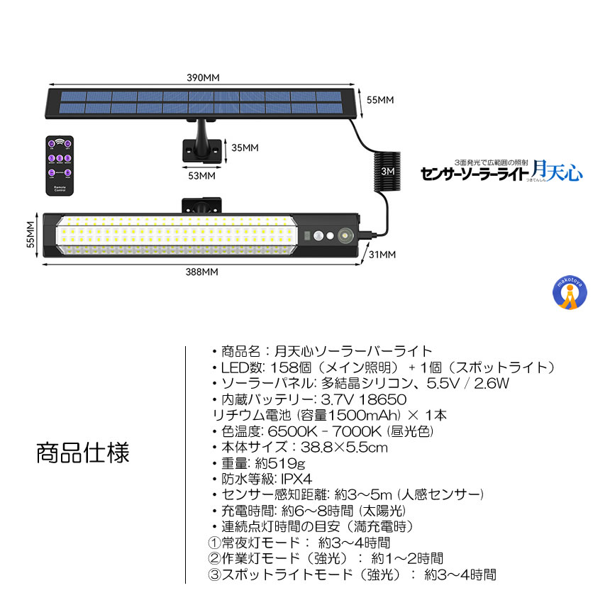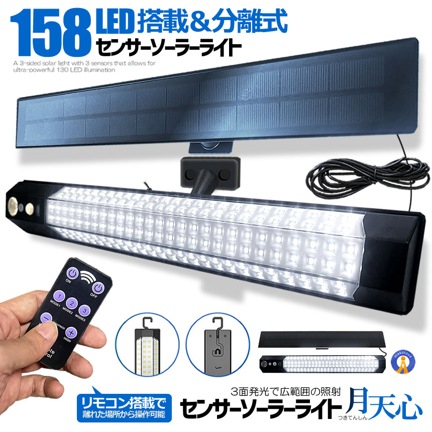 センサー ソーラーライト 分離型 リモコン付き 1灯 158LED 人感センサー 3つ知能モード 省エネ 防水 防犯ライト TUKITENSIN