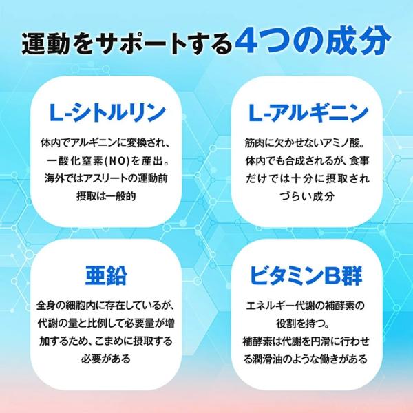 原材料名 | L-シトルリン、酵母/L-アルギニン、ゼラチン、結晶セルロース、ステアリン酸カルシウム、微粒二酸化ケイ素、V.B1、V.B2、V.B6、V.D、着色料(カラメル) |