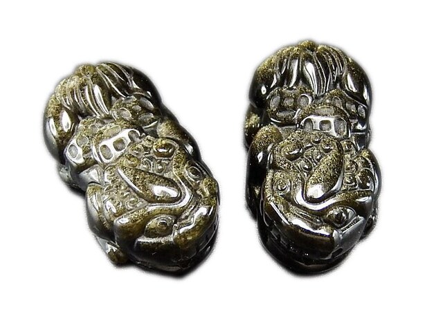良質ゴールドオブシディアン天然石金銭3枚背負う中型ヒキュウ彫刻ペア ヒキュウ単品サイズが約34.5x20x14mm