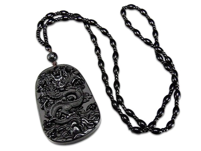 開運昇龍精工彫刻ペンダントトップネックレス改天然石オブシディアン迫力満点