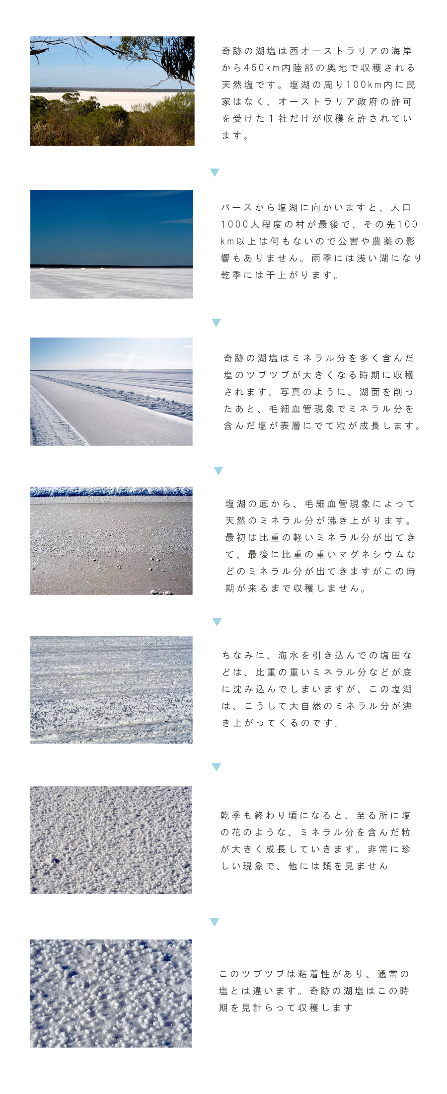 プラスチック製品が蔓延している中、海水にもマイクロプラスチックが含まれていることが問題となっています。その中でこの「奇跡の湖塩」は、西オーストラリアの奥地に500万年前から堆積した塩、500万年前のまだ汚染されていない海水から自然に作り上げられたので、マイクロプラスチックが一切含まれていない、まさに安心安全の奇跡の塩なのです。