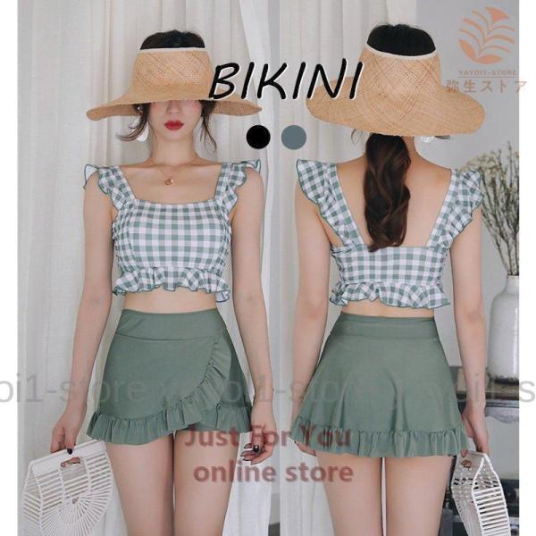 レディース 水着 ビキニ レディース ビスチェ水着 韓国 体型カバー 盛れる フリル スカート ハイウエスト 着痩せ 小胸 水着 セットアップ 黒/緑