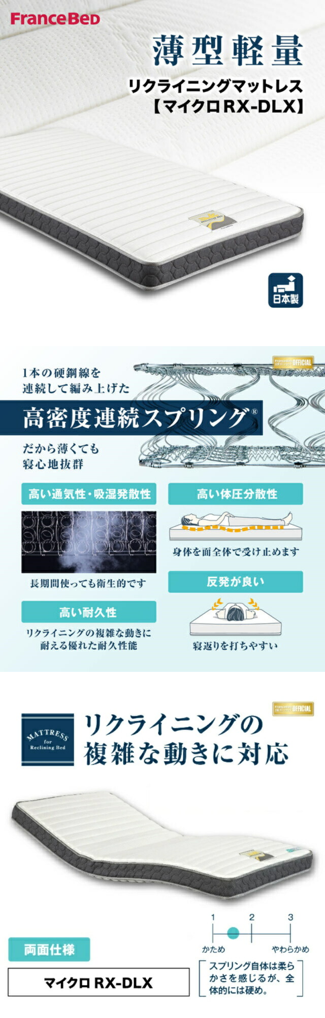 ■マットレス【マイクロRX-DLX】■フランスベッドの電動ベッド専用マットレスです。メーカー独自技術により、リクライニング機能対応!!●リクライニングの複雑な動きに対応した薄型軽量マットレスです。
