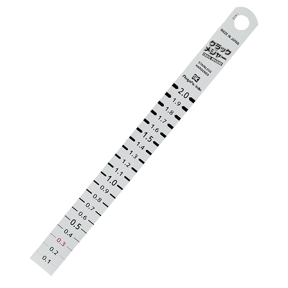 壁面や基礎等のひび割れ測定、寸法測定に。 0.3mm赤文字表示! クラックの測定に便利です。 欠陥の可能性があるひび割れ幅の目安である0.3mmを赤文字表示でわかりやすくしています。 裏面の直尺は1mm単位の目盛が見やすい段差型目盛です。 |