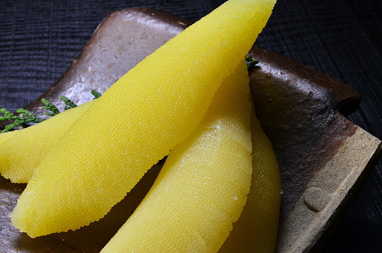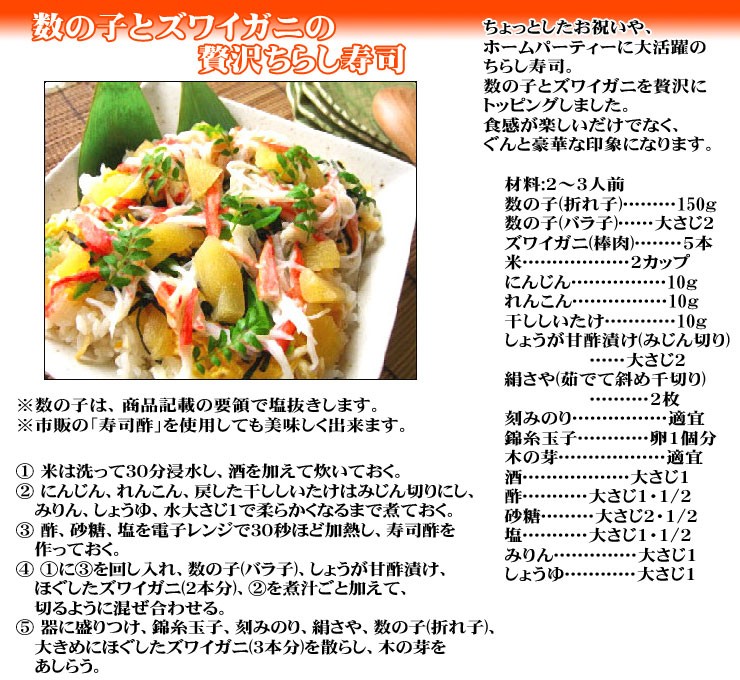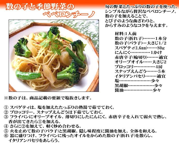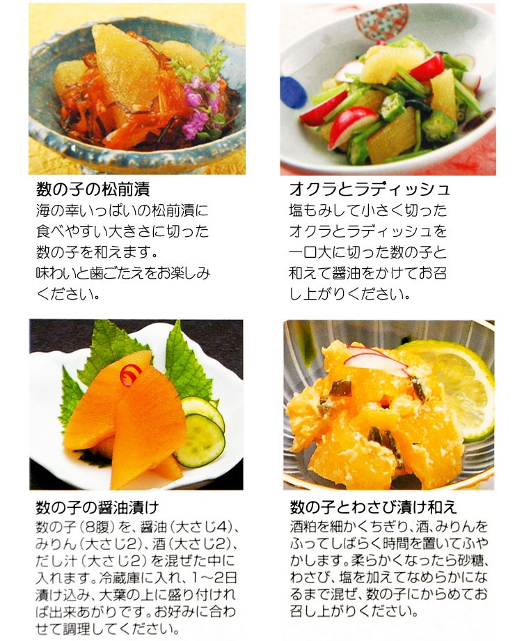 塩抜きした数の子を、そのつけ汁にひと晩漬込みますと、ひと味違った味わいがお楽しみいただけます。
