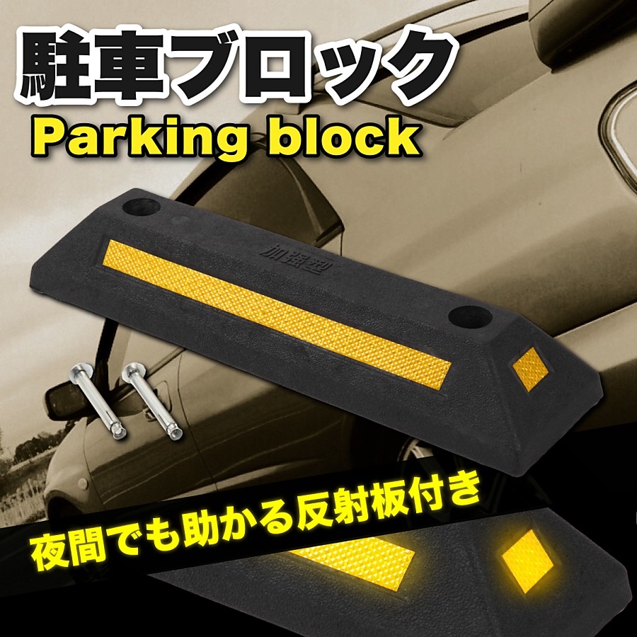 車止めブロック 反射板付き輪止め■車庫用の車止めです☆あるとないとでは入庫のストレスがちがいます♪■うっかり後ろをぶつける、飛び出すことがないので安心です■強いゴム+プラスチック製でコンクリート・アスファルト接着剤等で幅広く設置頂けます☆ ■しっかり止めたい時にはボルト用の穴が空いているのでボルトにて地面と固定も可能です♪ ■軽量タイプなので持ち運びも設置もラクラク♪ ■反射板が付いているので夜でも見やすいですよ☆ ■これなら運転初心者の方でも安心して駐車出来ます☆ ■お店や会社の駐車場も設置すれば来店客にも好評まちがいなし♪ サイズ・特徴 幅約55cm×奥行約15.3cm×高さ約8cm重量:約2.3kg駐車ブロック1点となります アンカーボルト2本入り※接着剤は付属しておりません。別途ご用意ください。■何点でも送料690円です※離島・沖縄は除く本格的仕様、反射板付きです
