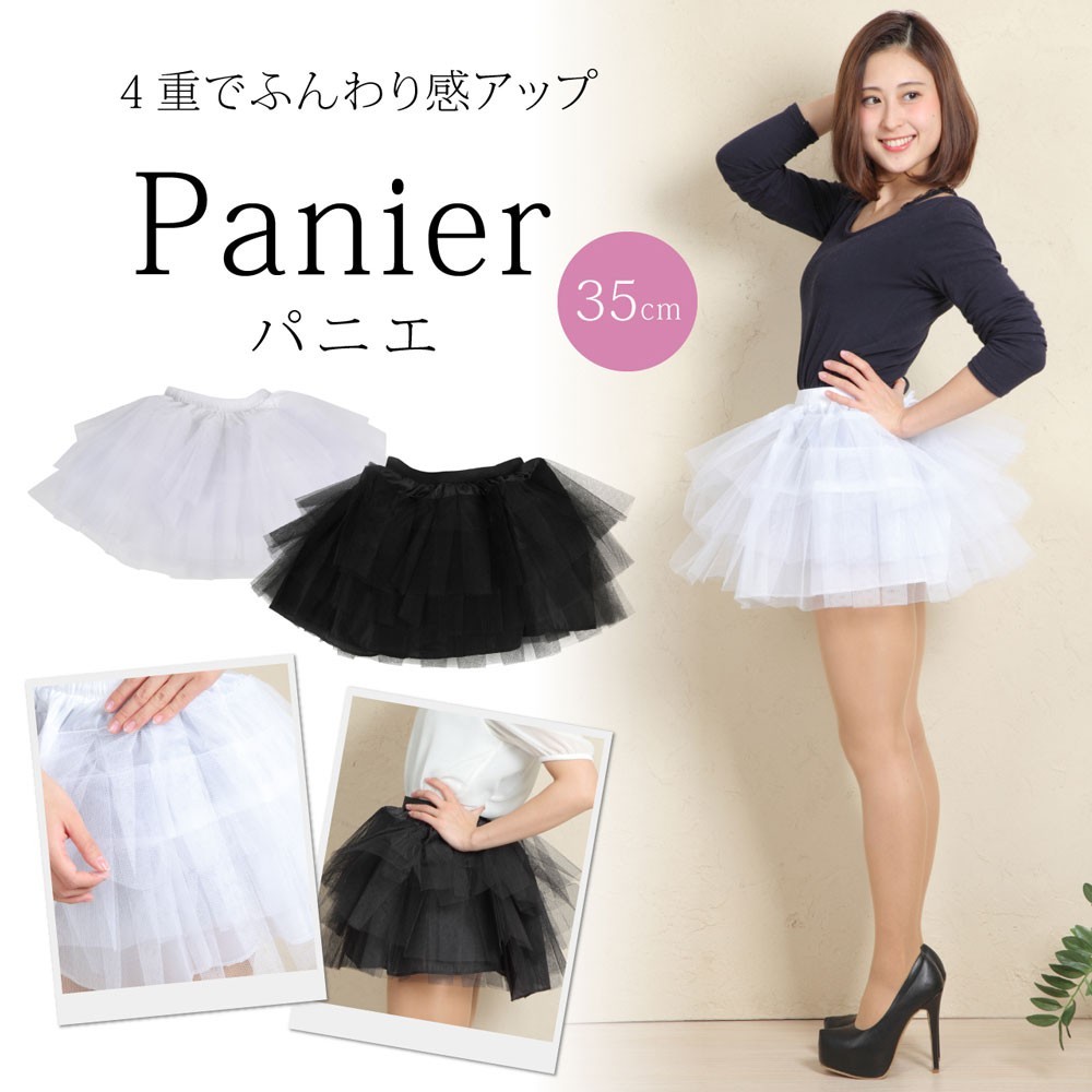 ボリュームたっぷりのレースパニエです♪ハードタイプのチュールでコスチュームはもちろん、ゴシック・ロリータスタイルやドレスもふわりと広がります◎ウエストはゴム仕様です。しかも、紐付きで安心!これ1枚でシルエットが変わるイチオシアイテムです! ★4層構造なので、ふんわり♪ボリューム感があって、めちゃめちゃ可愛いです♪ダンス・発表会に!!ゴスロリ系、メイド系のファッションアイテムとして是非!!サイズ・特徴 着丈:約35cm(伸ばした状態)ウエスト:約55cm〜約92cm素材・成分:ポリエステル100%140g ※ウエスト部はゴム仕上げですので、伸縮性があります