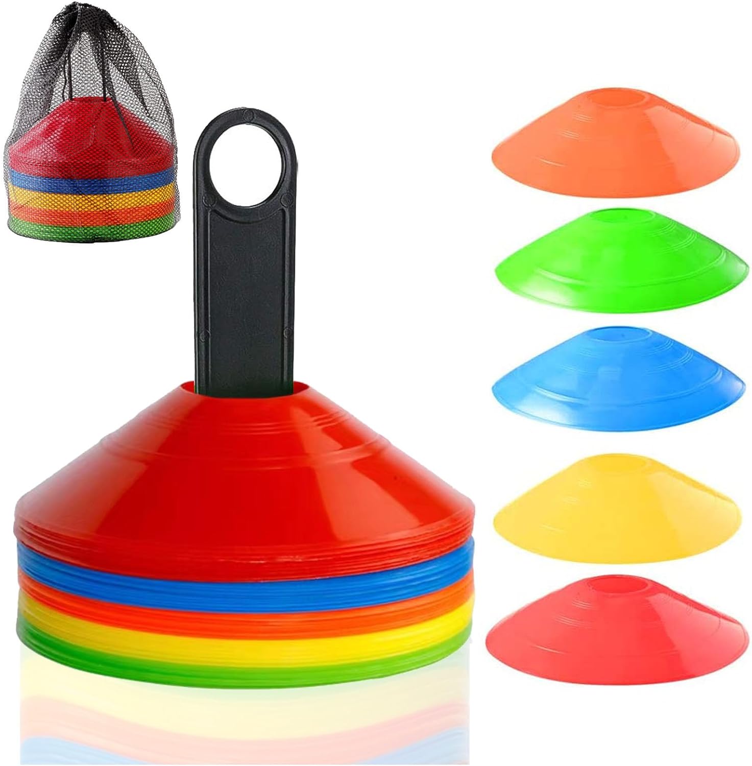 マーカーコーン 5色 50枚セット 収納袋付 サッカー ディスクマーカーコーン 専用フック付 フットサル 練習 スラローム ドリブル