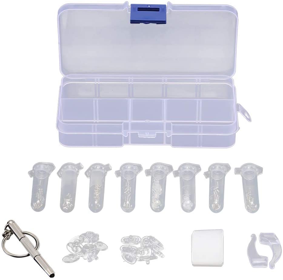 愛用のメガネやサングラスを自宅で修理。様々な作業に対応できる、豊富なパーツがワンセットに。ネジ締めや鼻パッドの交換など、多様な修理に対応!保管に便利な仕切り付きケース+細かな部品用の小分けケース付き。ドライバーはプラスとマイナスの一体型。便利なキーホルダーリング付き。セット内容:シリコン鼻パッド(大)×10、シリコン鼻パッド(小)×10、プラワッシャー(2種類)×各20、プラキャップ×20、ネジ(3種類)×各20、ナット(2種類)×各20、イヤーパッド×2、ドライバー(プラス、マイナス、ナット用)×1