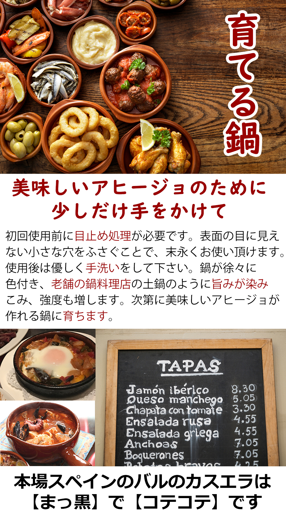 ●スペイン独特の土くささと温かみのある鍋で、使い込むと味の出る食器です