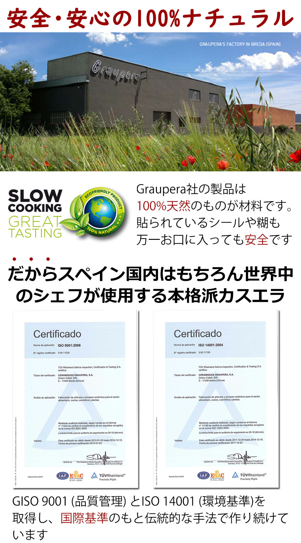 アヒージョ 両手鍋 Graupera スペイン テラコッタ製 カスエラ 深型 直火 オーブン 耐熱 陶器 土鍋 13cm sgr-0713br
