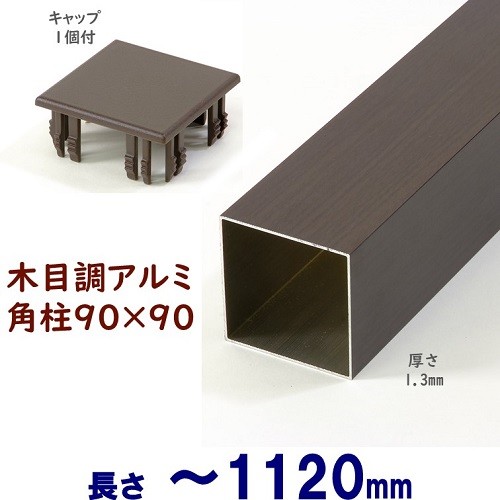 アルミ角柱 木目調 90角L1120mm 厚み1.3mm ダーク キャップ1個付 支柱 角パイプ