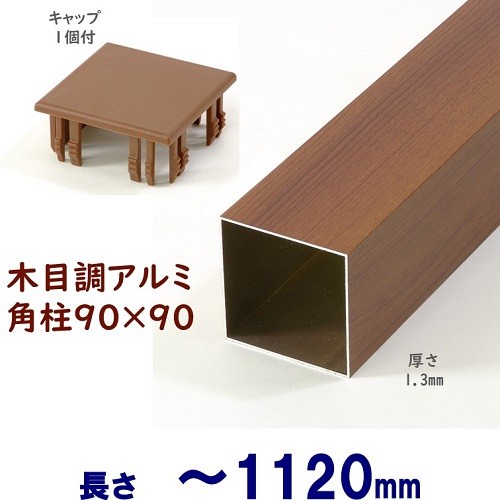 アルミ角柱 木目調 90角L1120mm 厚み1.3mm チーク キャップ1個付 支柱 角パイプ