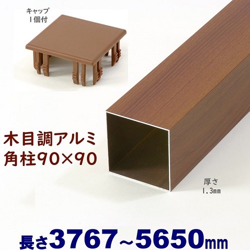 アルミ角柱 木目調 90角L5650mm 厚み1.3mm チーク キャップ1個付 支柱 角パイプ フェンス
