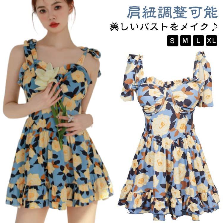 体型カバー レディース 水着 ワンピース フレア キャミワンピース水着 スイムウェア フリル 花柄 ガーリー 露出控えめ ウエスト お尻 太もも カ