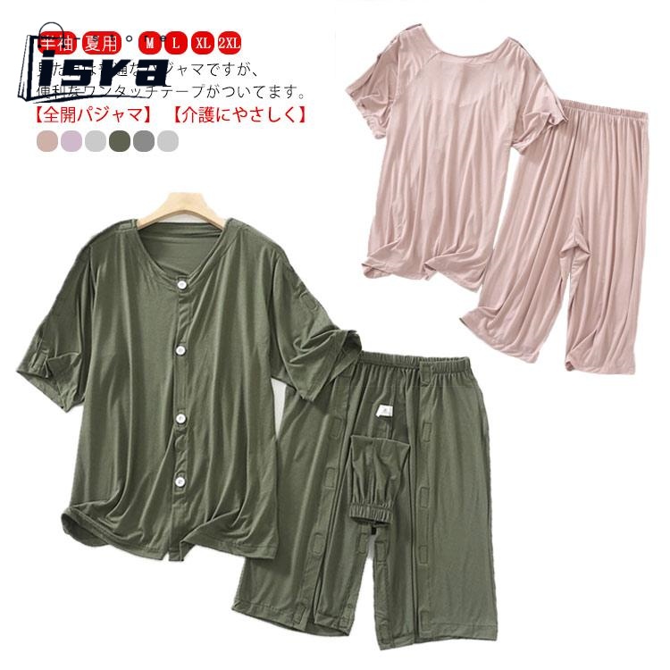 半袖 夏用 介護用パジャマ マジックテープ 全開 夏用 フルオープン 紳士 男性 女性 介護 綿 コットン パジャマ 寝たきり オムツ交換 両開き 両