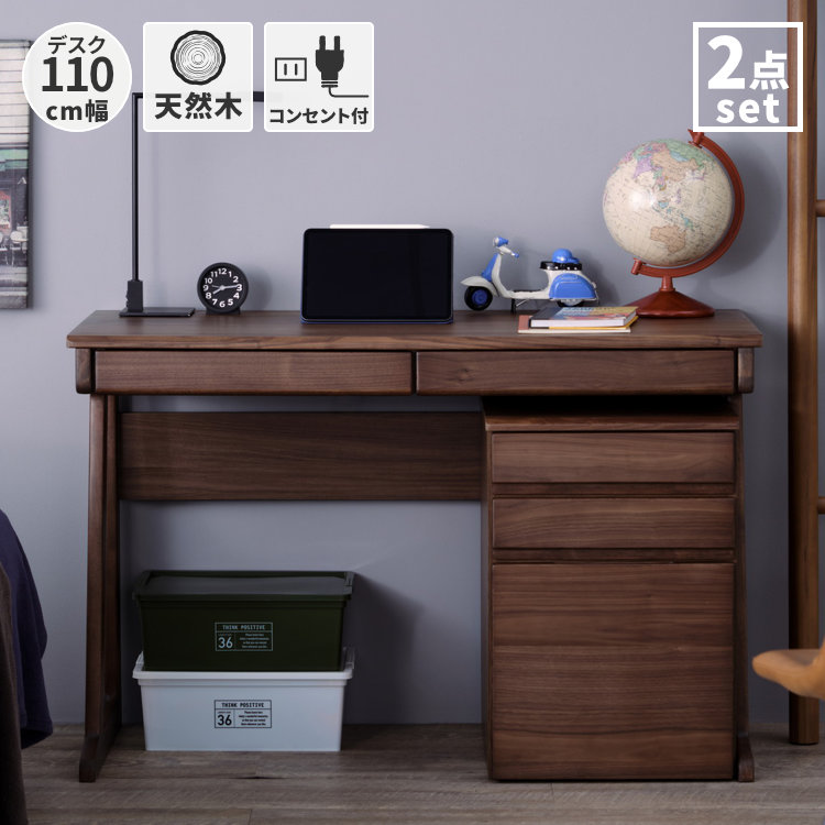 オススメポイント ウォルナット材を使用した落ち着いた雰囲気の110cm幅のデスクとワゴンの2点セットです。引き出しは全てフルスライドレール。引き出しや2口コンセントも付いて機能性も充実。お子様の勉強机から大人用のパソコンデスクやワークデスクまで、幅広く永く使える造りとデザインです。