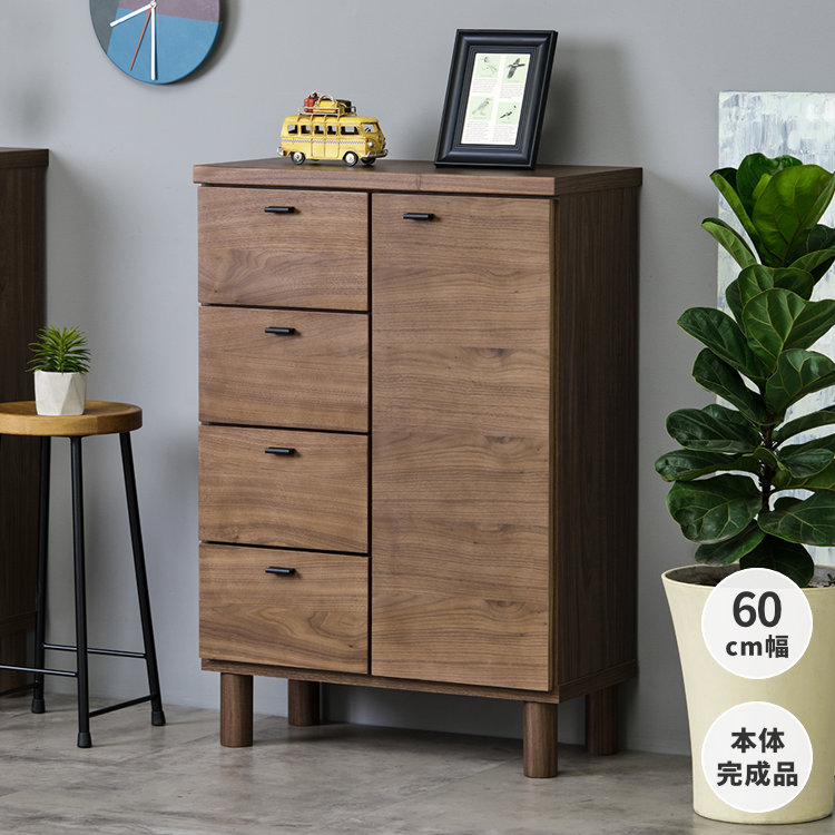 オススメポイント シンプルなデザインの中に優しい雰囲気を醸し出す北欧デザインのリビングチェスト。前板に天然木突板を使用したので木の風合いを存分に楽しめます。左側には安全に考慮してストッパーを設置した4杯の引き出しを。右側の扉収納内は収納するものに合わせて自由に調節することができる可動式の棚板付き。背面には配線を誘導できるコード孔が開いているため、ルーターやWi-Fiの配線もすっきりさせて収納可能。脚付き構造で掃除もしやすく、お掃除ロボットも通過できるのでいつでも清潔に保つことができます。
