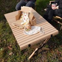 アウトドア、キャンプで大活躍の折りたたみ式ウッドロールトップテーブルです。