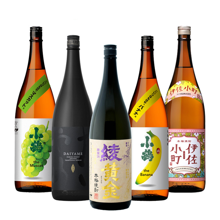 | 芋焼酎好きのあなたにオススメ!当店焼酎バイヤーが大好きなフルーティー芋焼酎を、なんと一升瓶5本での超大満足の飲み比べセットでご案内! 炭酸割りで香りを楽しむも良し!水割りで定番も良し!ロックでガツンとした味わいを楽しむも良し!お湯割りで芋の甘味を楽しむも良し! どんな飲み方でもフルーティーな香りと芋の旨味を感じられる5商品です! 乙25°本格焼酎 綾黄金 芋 1.8Lml 1本 メーカー:小正醸造 Alc:25% 主原料:綾黄金・黄金千貫 コメント:薩摩芋の魅力を全て伝えたい。薩摩芋の持つ味と香りの力を100%引き出したい。焼酎造りに懸けた熱き思いと、幾多のテイスティングを重ね巡り着いた答えが、黄金千貫と綾紫種のハーモニーに結びつきました。深い旨みとコクを醸す黄金千貫黒麹仕込みに、フルーティーでふくよかな香りの綾紫黒麹仕込みのベストバランス「74:26」。 乙25°本格芋焼酎 だいやめ 〜DAIYAME〜 1.8Lml 1本 メーカー:濱田酒造 Alc:25% 主原料:さつまいも コメント:濱田酒造独自の技術で誕生した「香熟芋」で仕込んだ本格芋焼酎。ライチのような華やかな香りが驚くほど広がります。甘くまろやかな味わいとキレの良い後味が特長です。華やかな香りを楽しみつつ食中酒として美味しく飲み続けられる酒質設計です。特に強炭酸水で割って頂きますと、より一層華やかな香りをお楽しみ頂けます。 香熟芋・・・当社独自の技術で誕生した香熟芋は、アロマリッチな香気を引きだす成分を増幅させたさつま芋。 乙25°小鶴 the Banana 1.8Lml 1本 メーカー:小正醸造 Alc:25% 主原料:黄金千貫 コメント:「小鶴 the Banana」は、ワイン酵母の一つで白葡萄の品種である「ソーヴィニヨン・ブラン(Sauvignon Blanc)」由来の酵母とさつま芋(黄金千貫)を組み合わせることで、まるでバナナのような甘く柔らかな香り、甘みと酸味のバランスの良い爽やかな本格芋焼酎ができました。 芋焼酎の「芋臭さ」から脱却した「小鶴 the Banana」は、ソーダ割りではバナナのような果実香を爽やかに楽しんで頂けます。美味しいつくり方はグラスに氷を入れ、焼酎を入れた後に、ソーダを氷にあてないようグラスの淵にゆっくりと注いでください。混ぜるのはマドラーで1回のみ。焼酎1に |