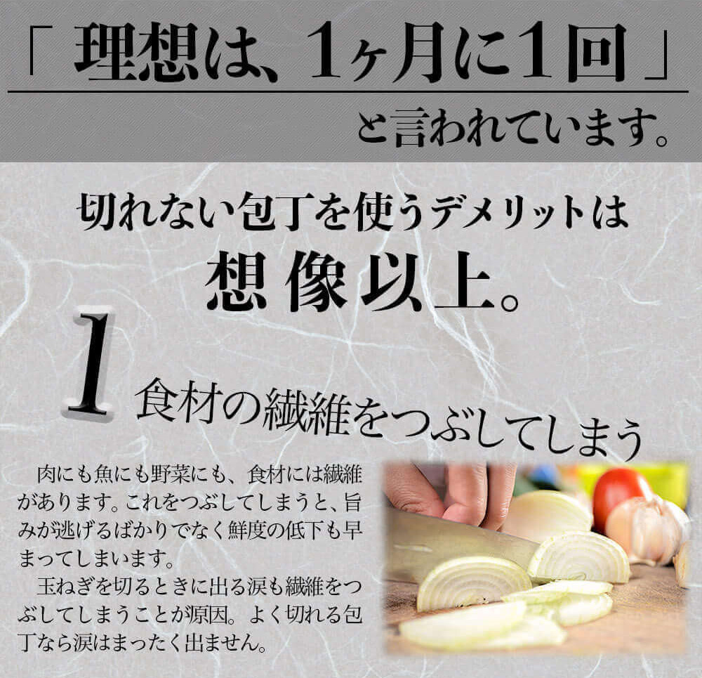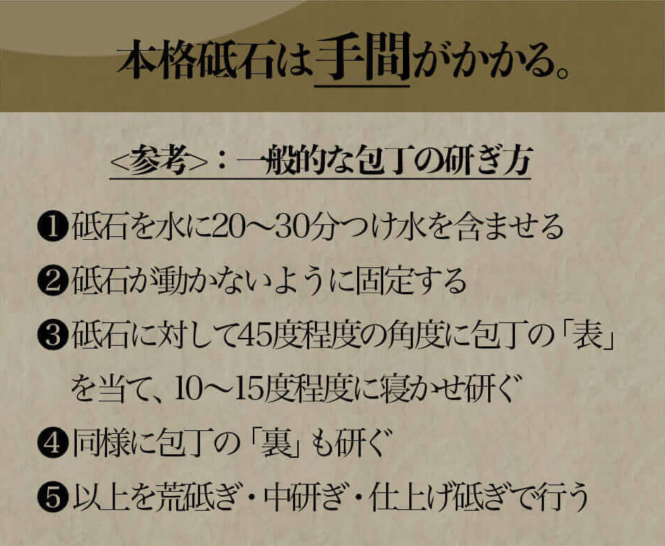 | 包丁の研ぎ方 | ・荒研ぎ(FINE)、中研ぎ(COARSE)、仕上げ(CERAMIC)の順に、各研ぎ口に包丁を差し込み、手前に5〜6回引くだけ ▼包丁研ぎ器の使い方のコツ ・一方通行で使用すること(前後に往復させない) ・本体と直角になるように研ぐこと(包丁を一定の角度に保つ) ・引くスピードを一定にすること この3点を守るだけで、あっという間に新品の切れ味が蘇ります。 ▼注意点 ・片刃包丁(出刃包丁など)や鋸刃の包丁にはお使いいただけません ・セラミック包丁は、仕上げ砥石(CERAMIC)のみお使いください ・食洗機もご利用可能(長持ちのためには手洗いをおすすめ致します) |