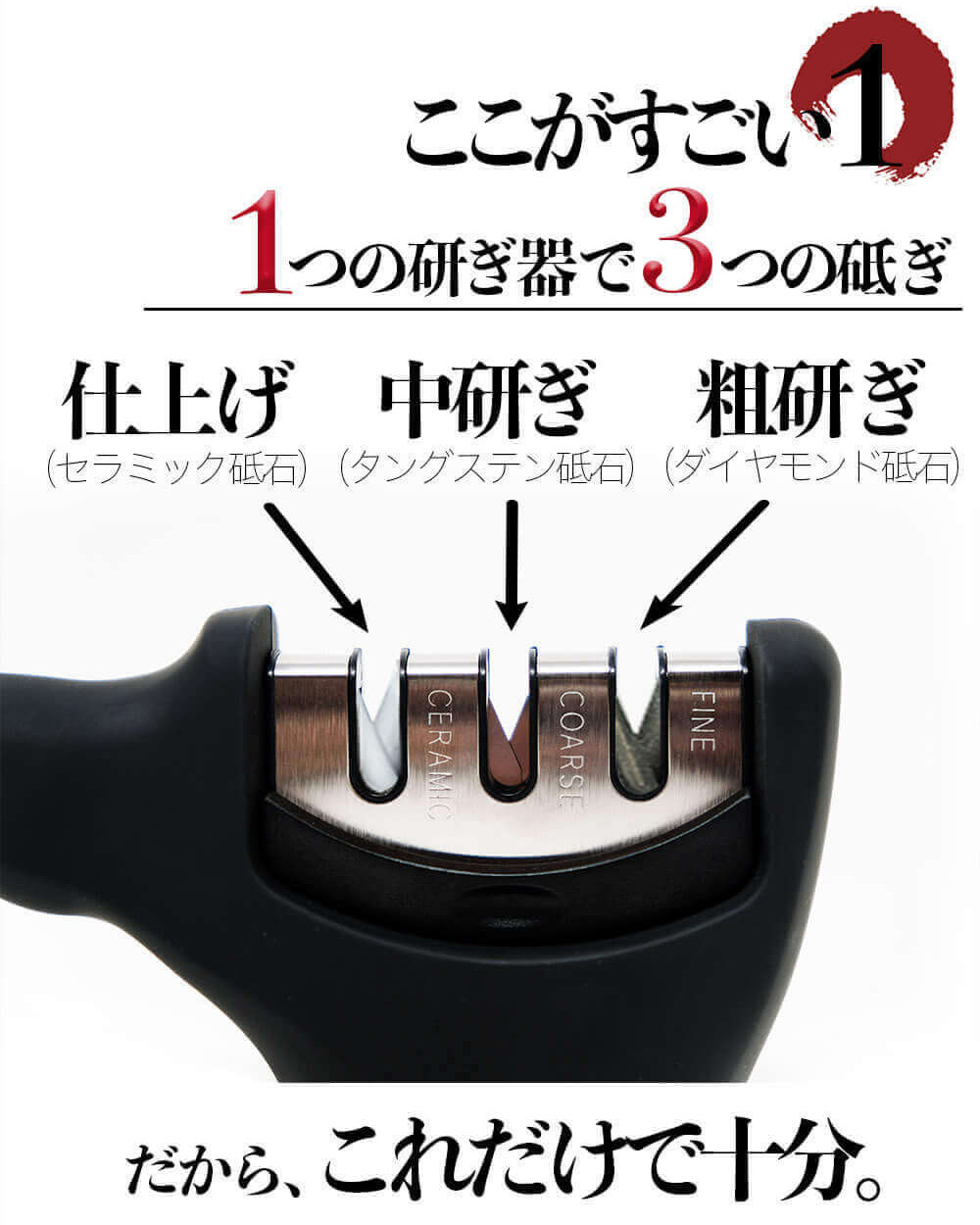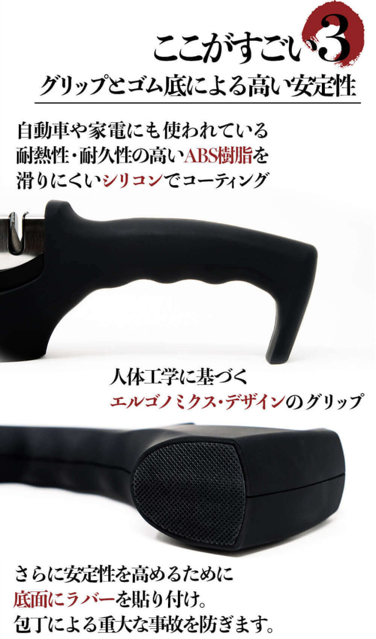 | ポイント | ・3段研ぎ石で、粗研ぎ、細研ぎ、仕上げの3つの研ぎ刃を備えています ・荒研ぎはダイヤモンド砥石、中研ぎはタングステン砥石、仕上げにはセラミック砥石を使用 ・たった1分でOK!初めてでも簡単に包丁研ぎができます ・素材の違う砥石素材なので、さまざまな刃先の消耗具合にも対応 |