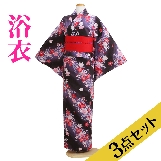 浴衣レンタル 浴衣レディースセット 浴衣 レディース 3点セット NT-y024 黒色 桜 浴衣セット 往復送料無料