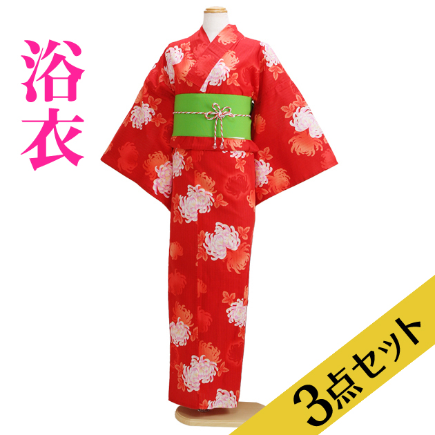 浴衣レンタル 浴衣レディースセット 浴衣 レディース 3点セット NT-y025 朱赤 菊 浴衣セット 往復送料無料