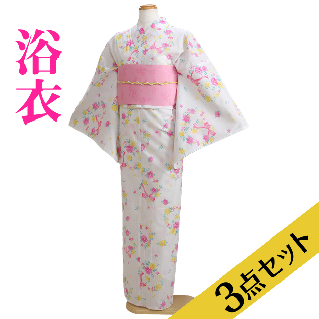 浴衣レンタル 浴衣レディースセット 浴衣 レディース 3点セット NT-y034 白色 リボン 浴衣セット 往復送料無料