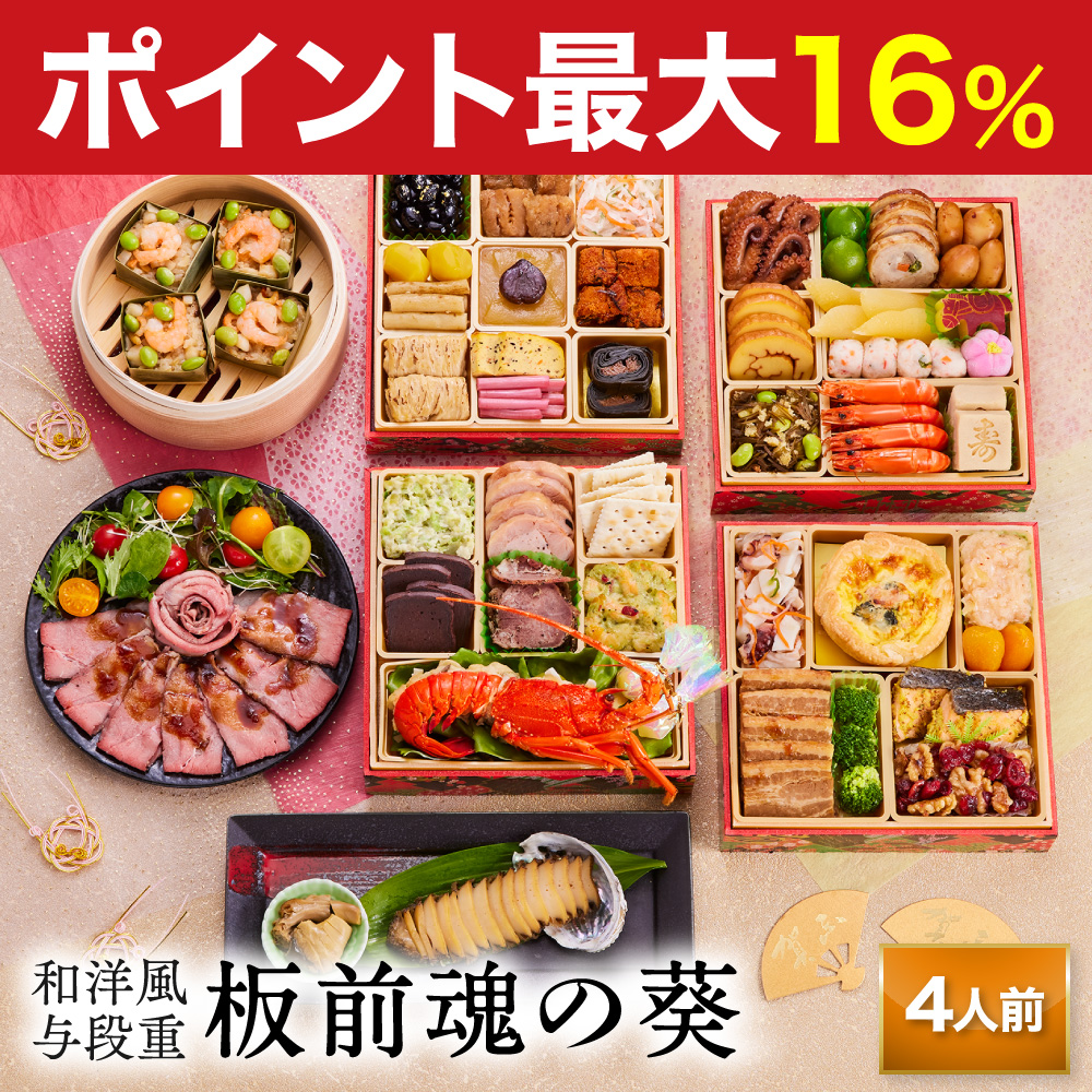 板前魂 の おせち料理 は、函館、 小樽 、仙台、 築地 、山梨、金沢、浜松、 京都 、下関、 博多 、鹿児島 など 日本 や 海外 の産地をまわり 厳選 した 食材 を使用し、 有名店 や ホテル で修行した シェフ や 繁盛店 を営む 板長 といった 4人 の 匠 が 監修 しています。