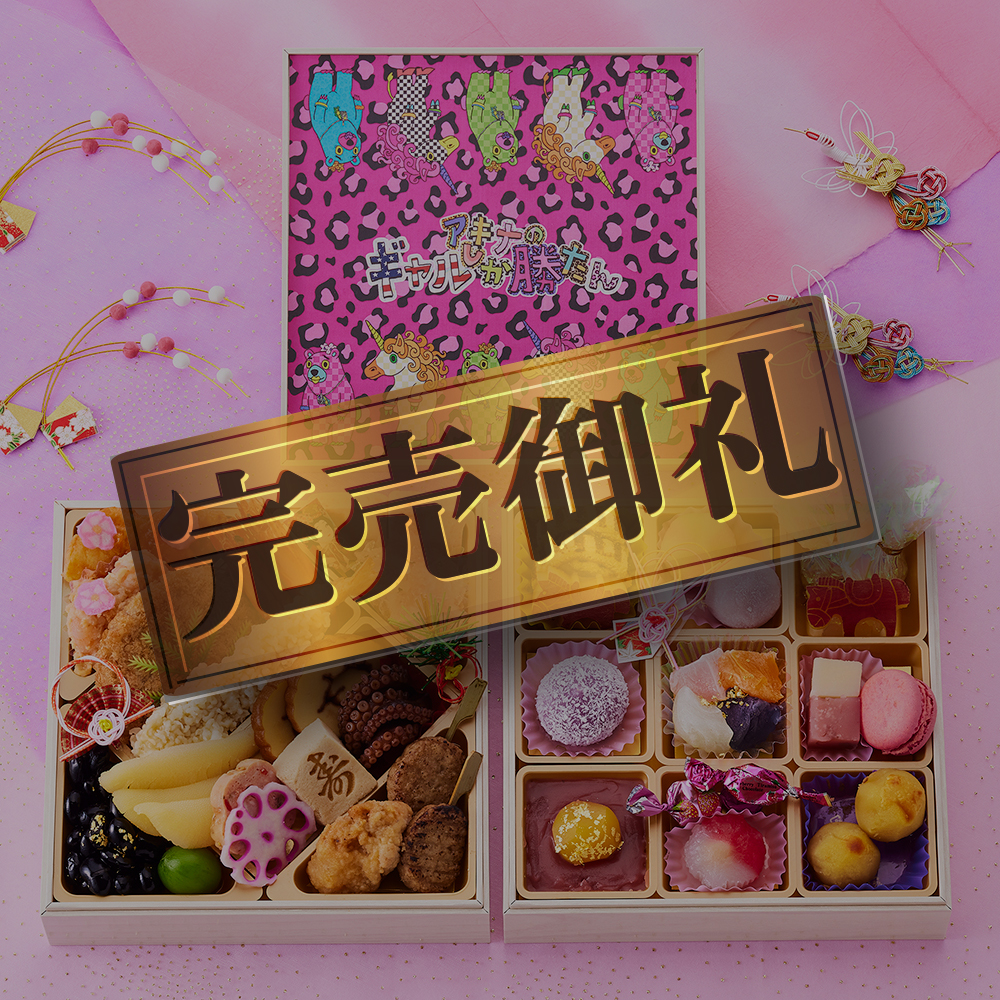 品目【一の重《福バイブス段》】長生きギャル マヨマヨフォーエバー/海老のチリソース煮/花形かまぼこ/チーズで繋がるサケバイブス/イカの桜風味ジュレ和え/黒豆/若桃甘露煮/取り込むギャルチキ/焼きつくね串/勝ちメンチ/有頭海老の艶煮/ぷり天ラッキーウェーブ/味付数の子/寿高野豆腐/れん恋バイブス/フラワーパストラミ/伊達巻/たこの旨煮