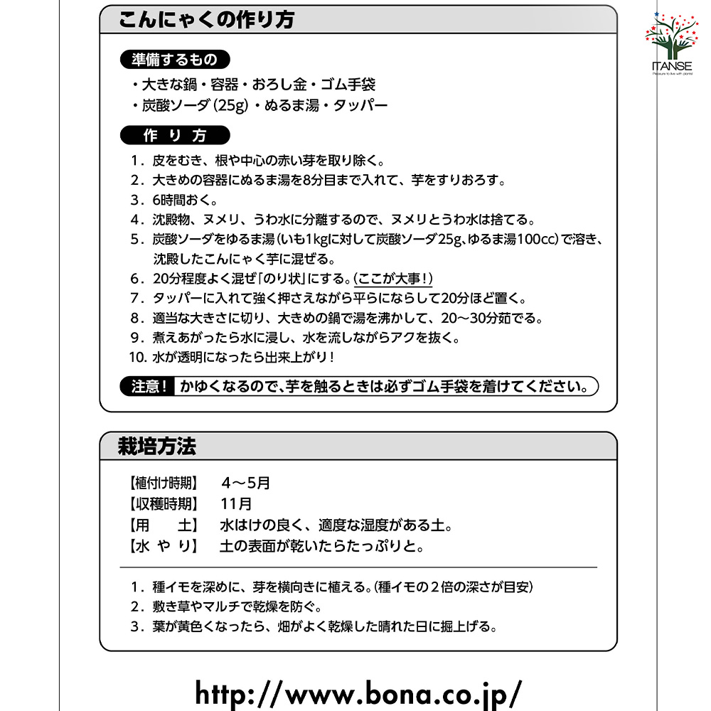 ※こんにゃく芋にはシュウ酸カルシウムが含まれており、素手で触るとかゆくなることがあります。収穫や調理の際は、必ずゴム手袋などを着用してください。