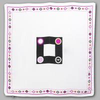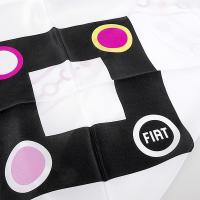 ホワイトベースで、いくつもの丸とそれを繋ぐラインが描かれた、華やかなデザインのFIAT純正スカーフです。デッドストックアイテム。FIATのイメージカラーから離れて、独特の雰囲気を作り出しています。斬新なデザインとカラーリングがとても新鮮です。もちろんシルク100%。
