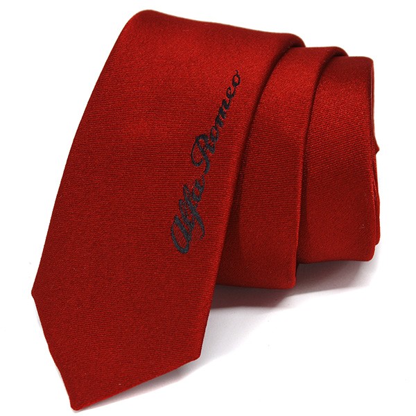 深みのある落ち着いたレッドのシルクネクタイです。やや細身のナロータイプデザイン。Alfa Romeoロゴが同色でネクタイの先に織り込まれています。とてもシンプルで品のある一本。デザインはすっきりしているのですが、落ち着きの中にも華やかさの感じられるネクタイです。